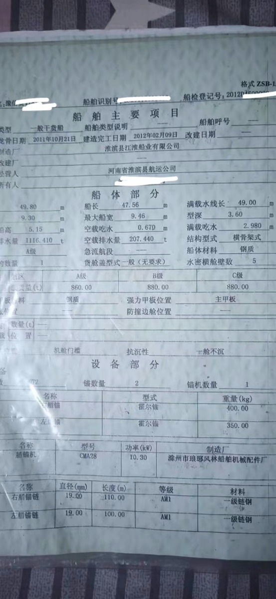 直降6万,吉售:49.8/9.3/3.6米,2012年元月建于淮滨江淮船厂,总吨499t,主机淄博450马力,前驾液压,通仓双站:甲板.大川10个,底板.挂板7个,水绞.二层板8个,包双站11道顺龙筋55下料,3道主龙筋10个,副龙筋7个,双站内结构:外全强30下料,内一副一强+每边3道大刀片,仓口29/31米,后楼1.6米,去年油漆保养,今年机器大修,有装粮管.架,自动棚架,雷达.卫导测水仪等电讯齐备,诚恳价110万