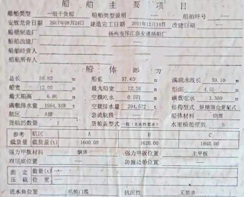 吉船60*12*4前驾驶一楼半,2011年12月扬州泰安造江苏户;用料15*60双站通仓,3道12;板厚全船外掛8,双甲板上面12,下面10,二层板10,大川12;仓口38*9.2,主机淄博408*2。开价206万。