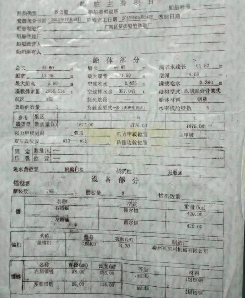 吉船 63 *11.4 *4.10前驾液压楼,2013年7月扬州造安徽户;用料7*75双站通仓双甲板;板厚底10挂8,主甲板二层板12;仓口42米,后楼高度1.8米,总吨892,主机潍柴408*2;报价230万,