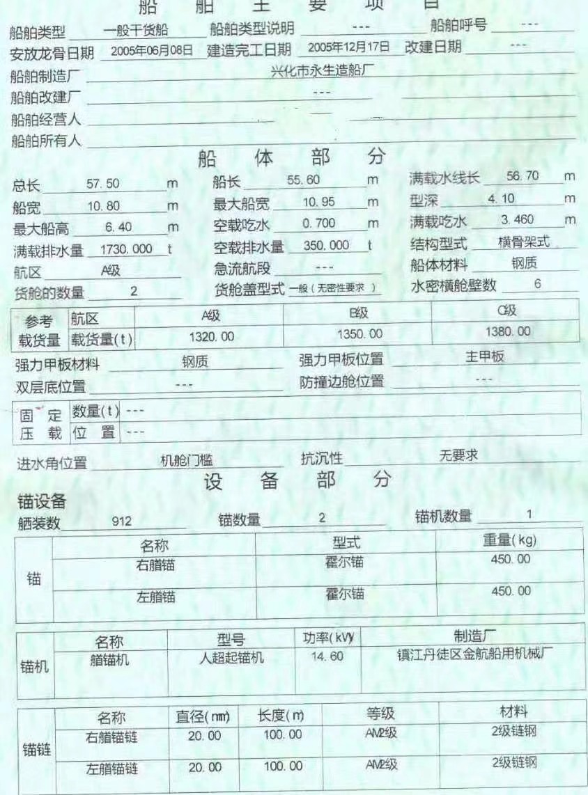 57.5*10.80*4.1中驾驶,2005年兴化造安徽户;用料11*50双站空梁,板厚底挂二层板8,甲川12;总吨812,舱口上面33米下面36米,主机两台275;报价66.8万。