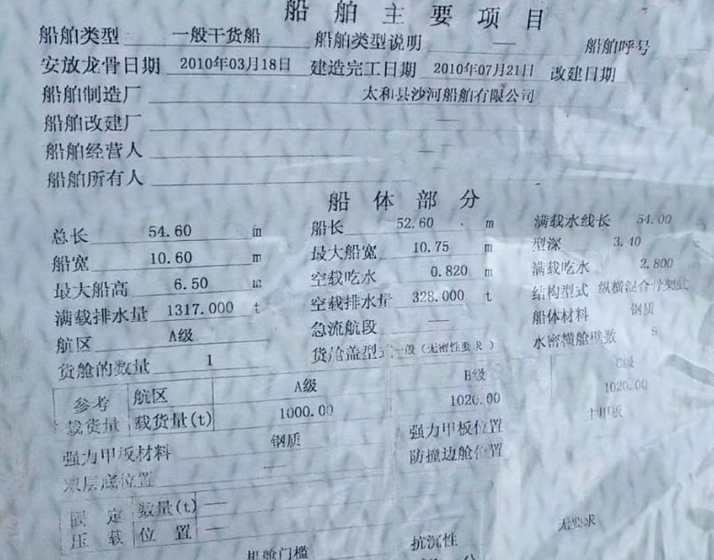 54.60*10.60*3.4前驾驶液压楼,2010年7月太和制造安徽手续;用料龙筋15道51下料,双站通仓,板厚底挂8甲川10;仓口34米,后楼1.6米,总吨595,主机潍柴275*2,配员2人;船上设备齐全, 自动封仓雨布架、机划子;报价142.6万,