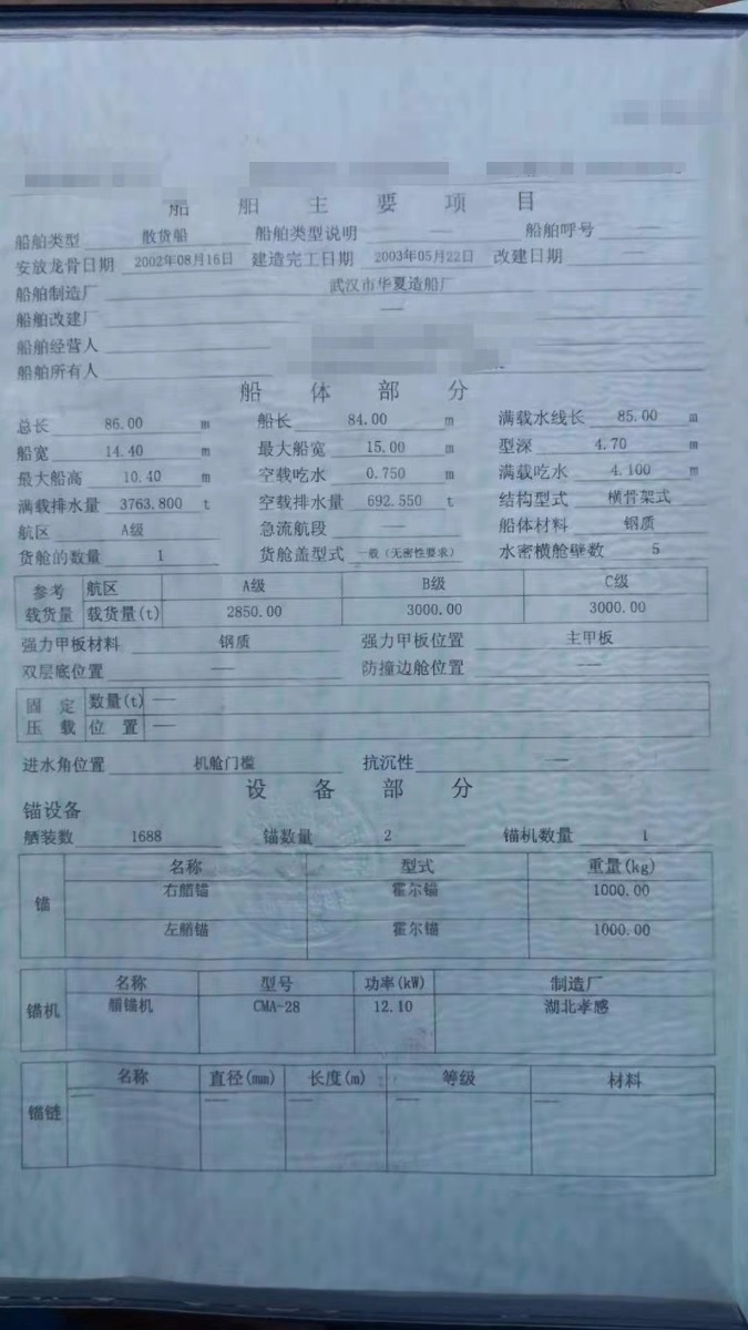 吉船86×14.4×4.7(约4074吨)武汉造,周口户,2003年5月完工,2台620潍柴 ,2018年换的新机器和二层板,总吨位1978,设备齐全,质量一流,报价230万元