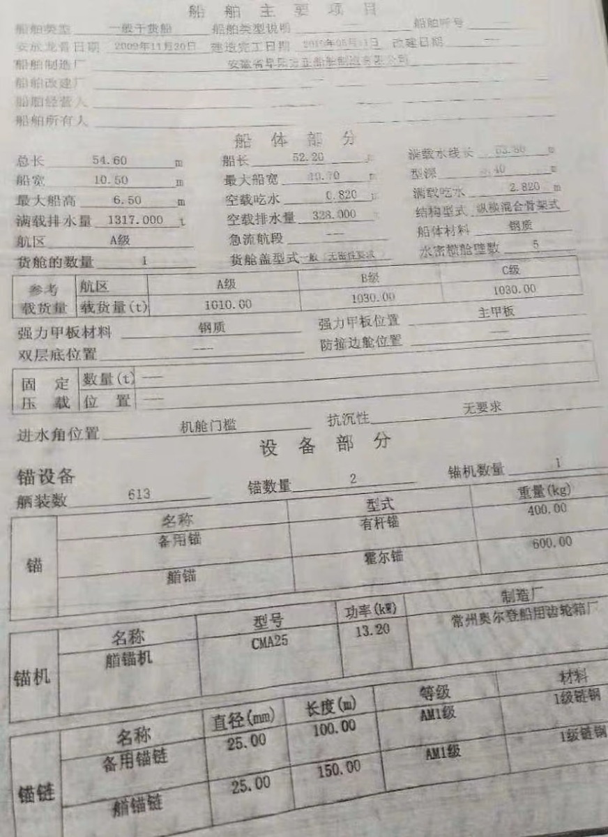 吉船54.6*10.5*3.4前驾驶液压楼,2010年太和造安徽户;用料15道560下料折成500,双站通仓;板厚底挂8甲川10;仓口34米,主机潍柴275*2;报价128万。