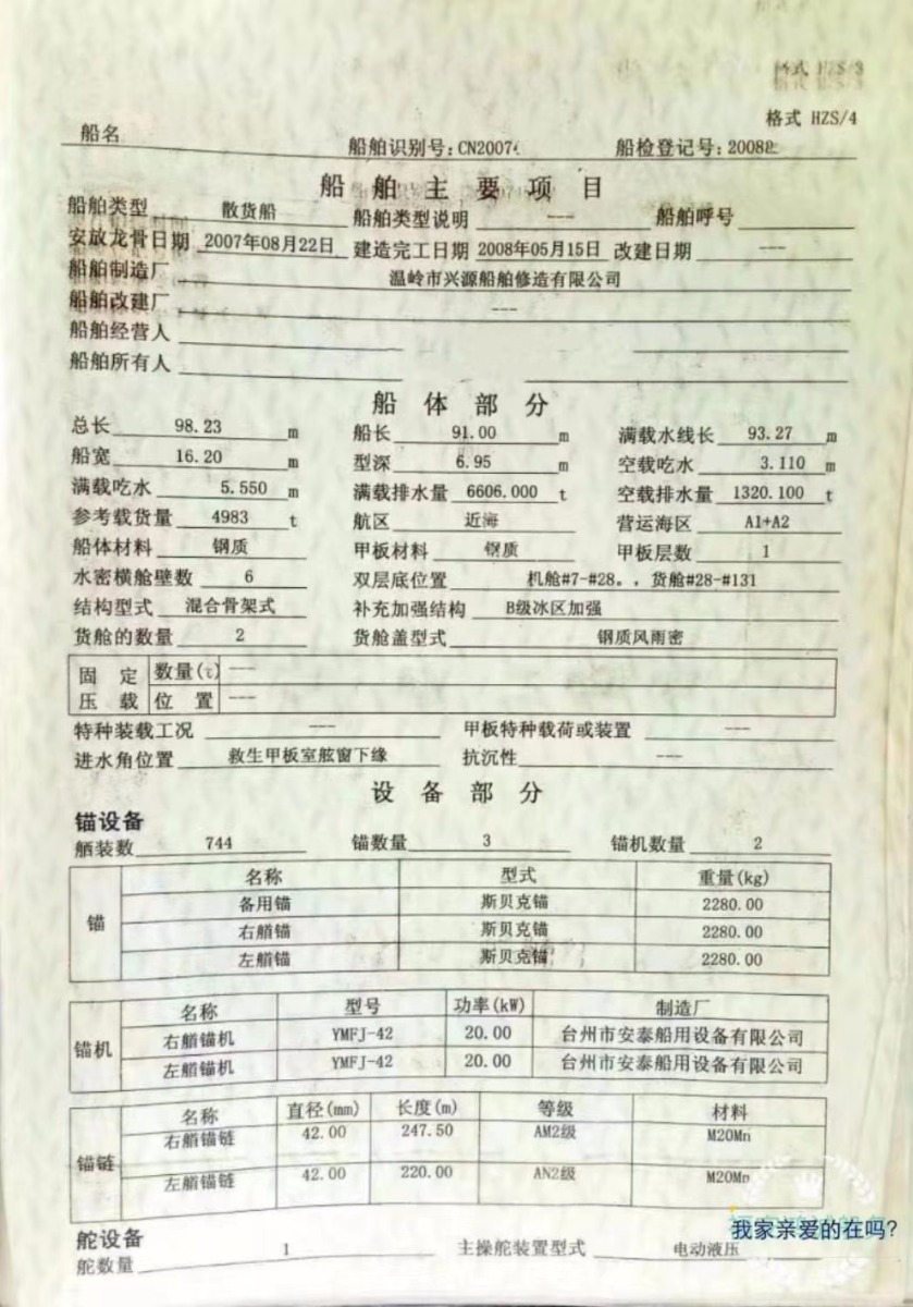船东降价出售5000吨散货船:2008年5月浙江造,总长98.23m/船宽16.20m/型深6.95m/满载吃水5.55m/主机宁波中策G8300型2720马力,船级社ZC:在航船舶,价格1090万
