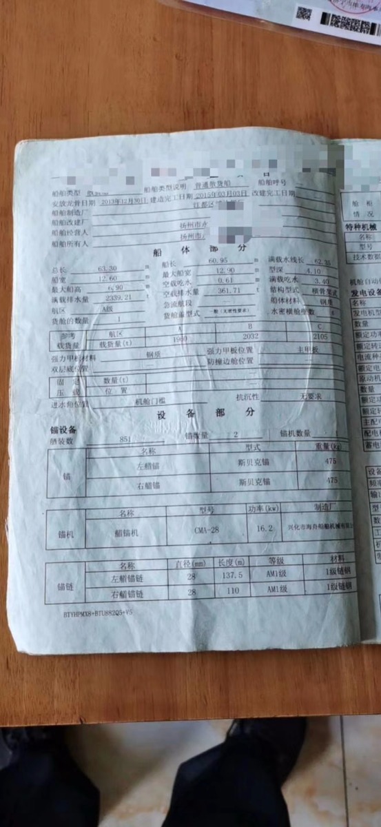 前驾 63.3*12.9*4.1=2343,2015年3月江都造,户籍港扬州,尖头前驾,小楼子固定总高6.9米,