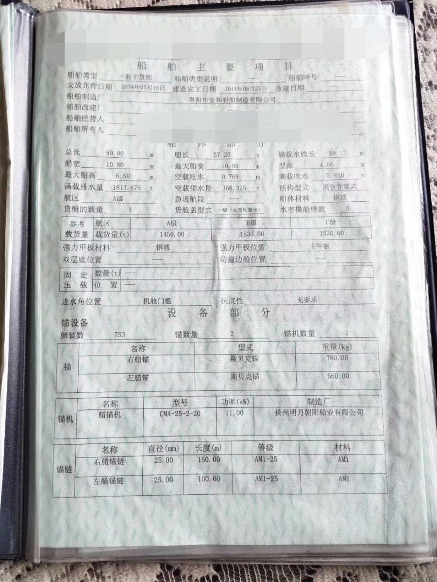 2014年10月份,太和造,甲板二层板大川10个,船板武汉船板8个,导航设备齐全,前后锚600.700.800,机划小船,棚架齐全。