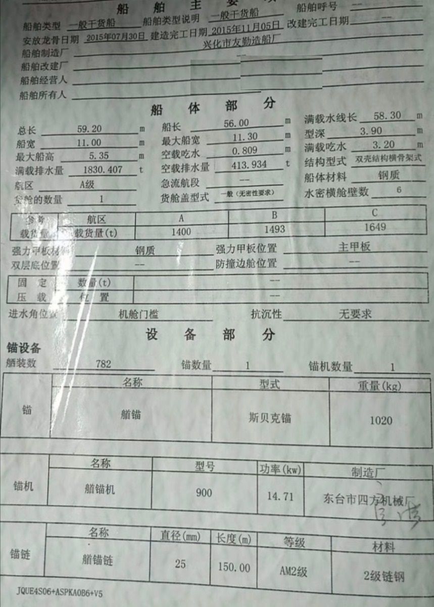 2016年正月开航,外板,甲板,大川,二层板全10,双甲板,前后六寸泵,前后三台交流发电机,前后空调,雷达等助航设备齐全,