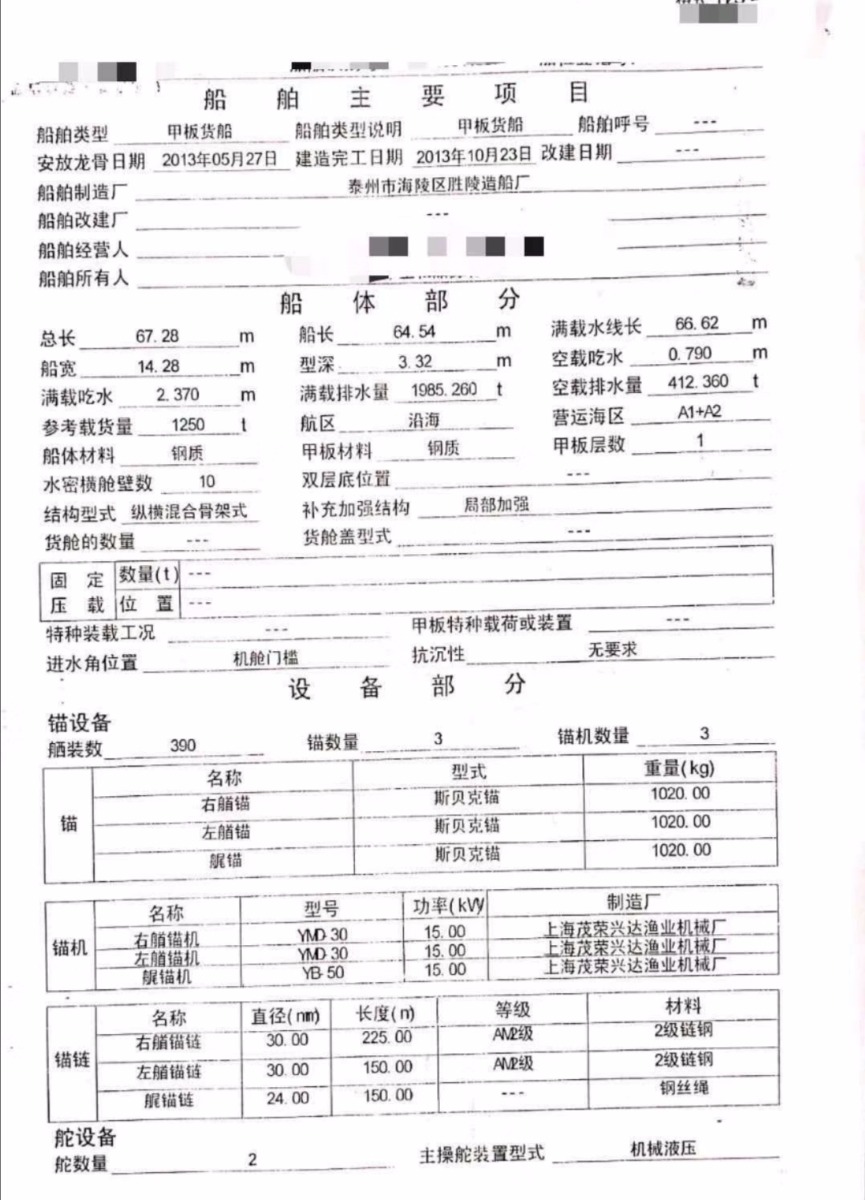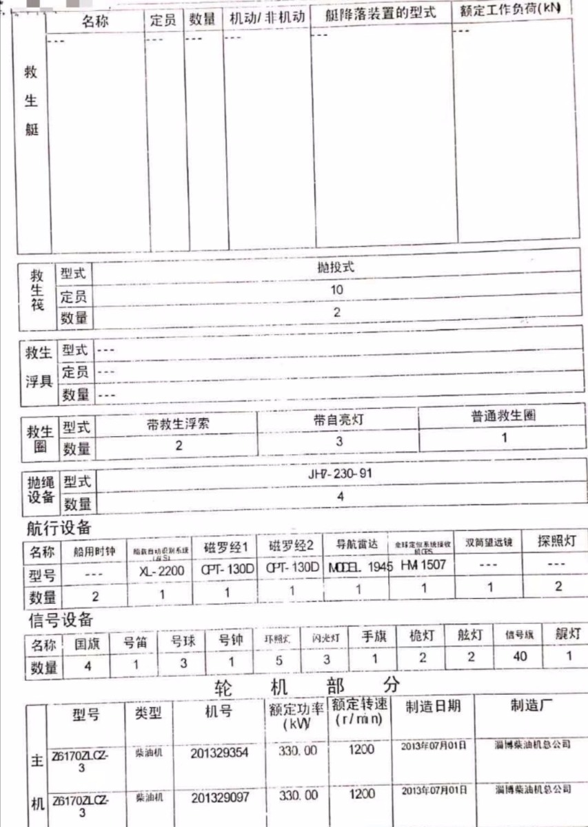 2013年67.28米2232吨货船r/吉船长宽深:67.28米14.28米3.32米;主机型号:z6170x2;登记报价340