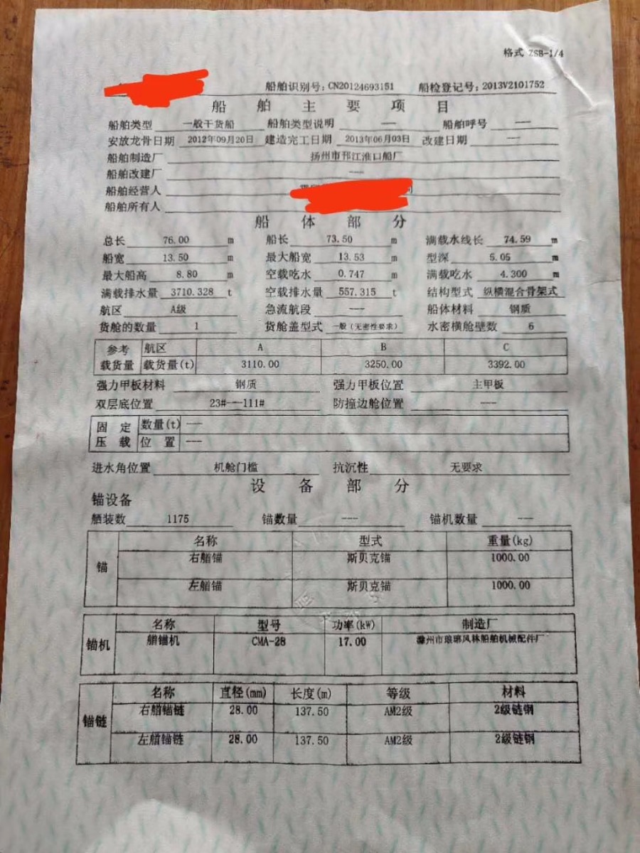 2013年7月扬州造吨尖双通舱龙骨7×90外挂上10中间8甲板二层板全12,双甲板上舱口47米,3626吨报价360万,