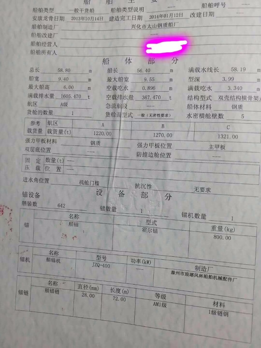 2014年58.8米1568吨货船r/吉船长宽深:58.8米9.55米3.99米;主机型号:淄博524;登记报价186万