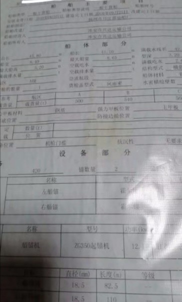 吉船出售:43.8/8.4/3.2米,2010年10月建于扬州邗江船厂,总吨345t,主机潍柴350马力,前驾液压升降: