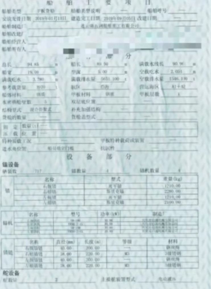 吉船长宽深:94.85米+19米+5米; 主机型号:玉柴6200x2-1200;