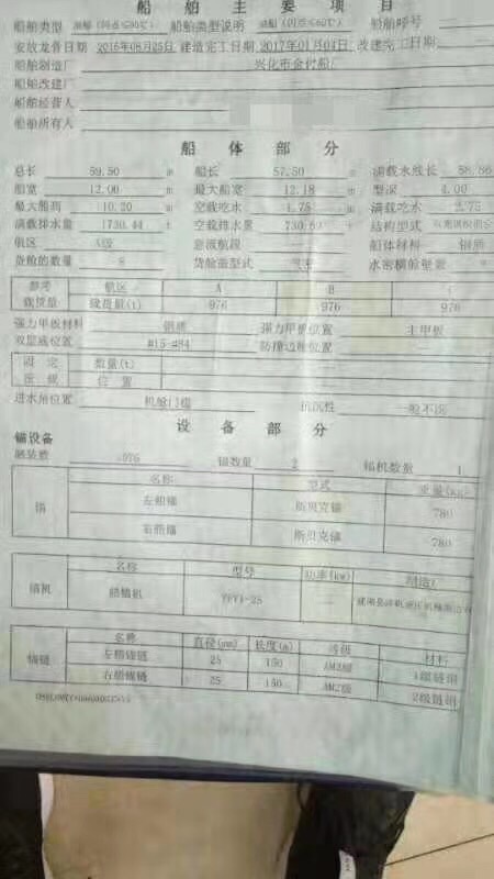 仓容1461方,手续泰州,总吨862,配员6个,价格392万