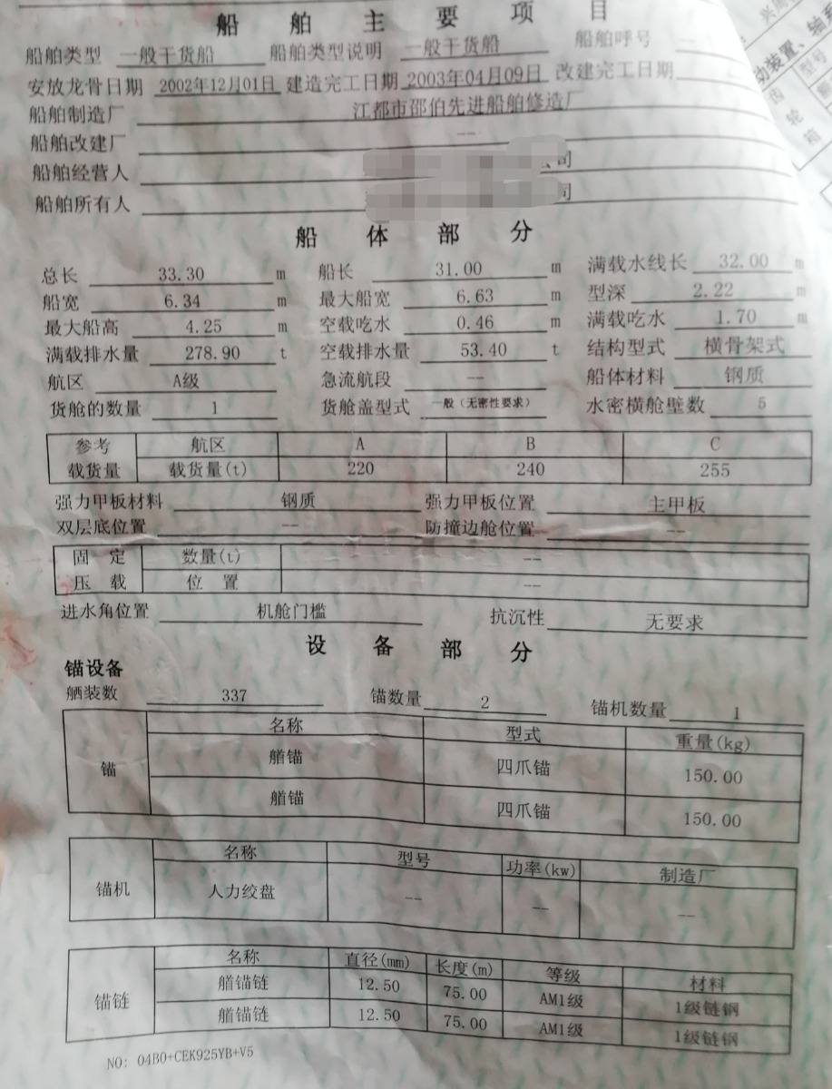 吉船长宽深:33.3米+6.34米+2.22米; 主机型号:6135ACa-上柴;