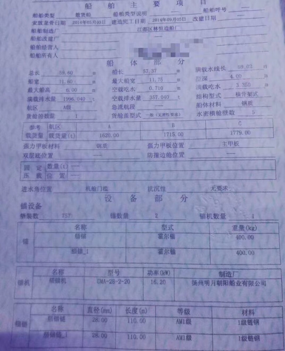 2014年9月江都造安徽户;用料底龙筋15*58双站通仓双甲板全强,板厚8-10-12;仓40/42/9.35,