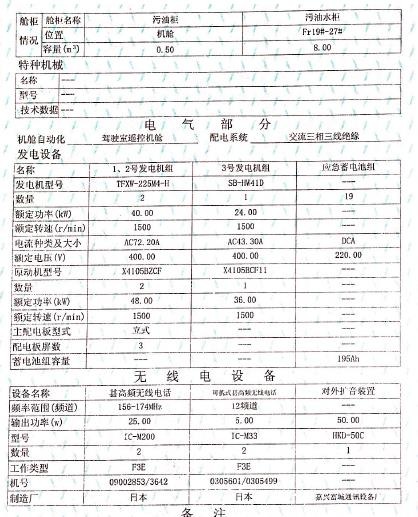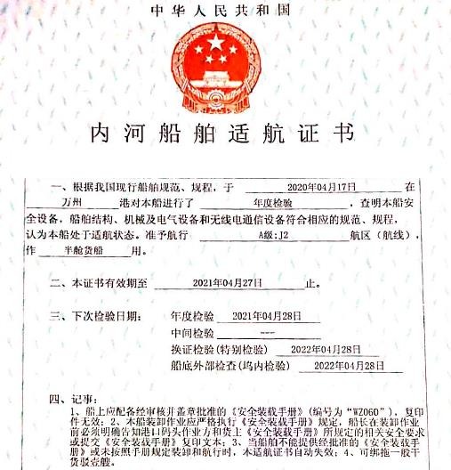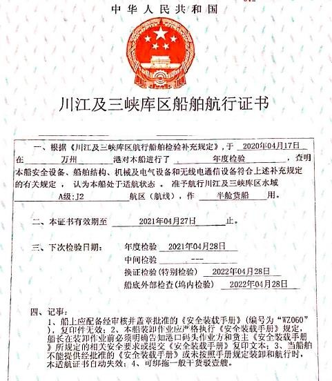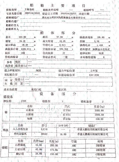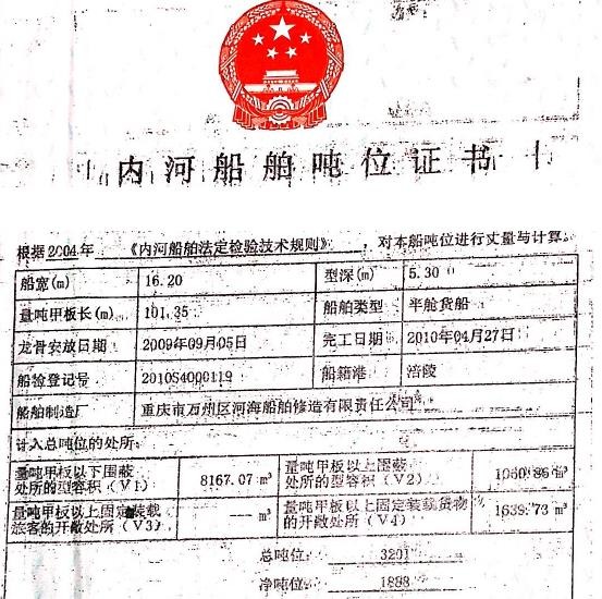 川江J2证书,证书总吨3201,净吨:1888,满载排水量6202吨