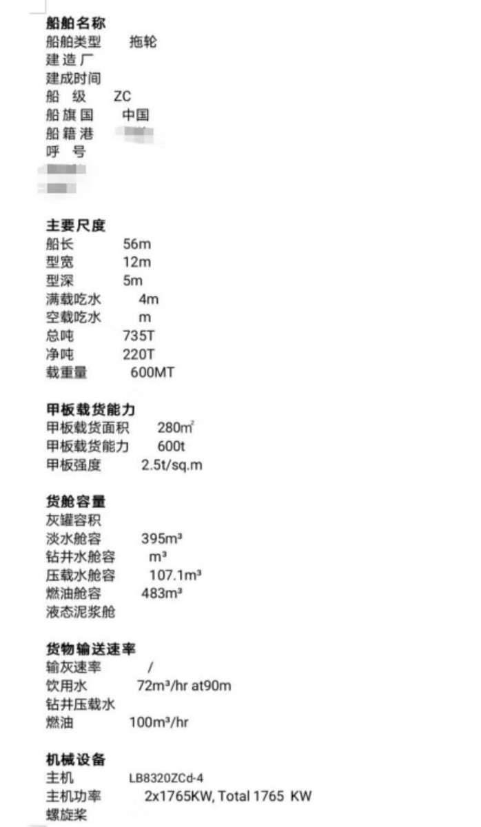 船长56米宽12米深5米满载吃水4米。主机8320型1765千瓦两台4800马力。