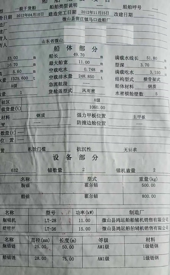 吉船出售:53/10.7/3.7米,12年11月底建于留庄马口船厂,总吨597t,主机淄博350x2马力,前驾一楼半.双站:甲板.大川10个,外壳全8个定尺板,二层板8个,15道底龙50折45,主龙筋3道10个,副龙7.25板,双站内全强:外30下料,内25下料,仓口32/34米,后楼1.8米,前后锚.机划子.焦碳设备.雷达.卫导.高频.测水仪.污水器等具备,开价155.6万,可议!