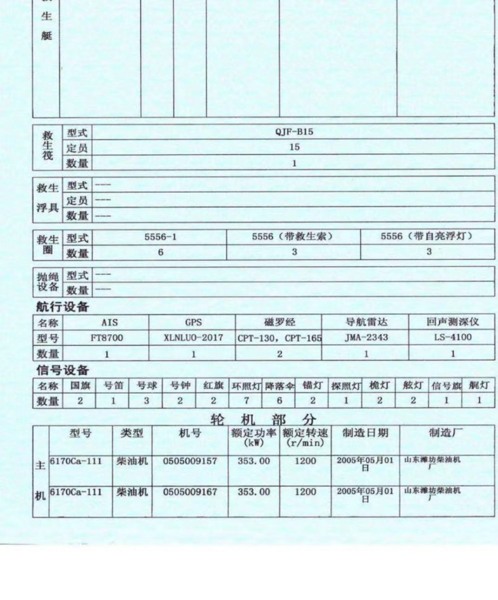 主机 潍柴6170,功率 353KW*2台, 参考载重吨位 1671吨