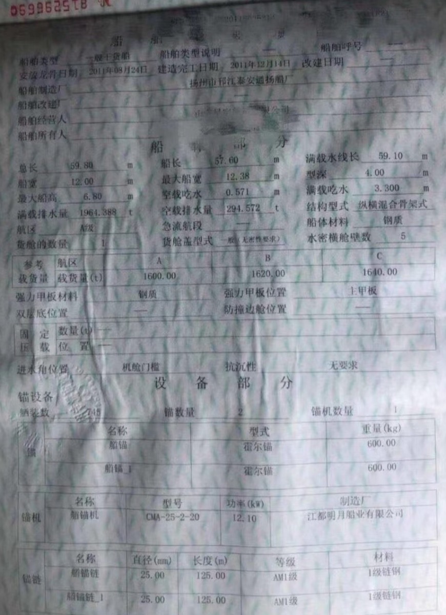 吉船59.8x12✘x4扬州2011年12月造。济宁港,双甲板,通舱。60/17道/5道主12。底10,二层板10。挂8。甲川12。舱口37.5/总吨867。