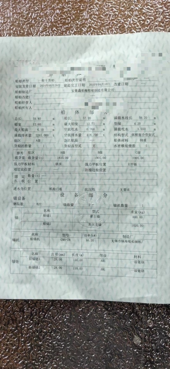 吉船59.8×12.6×4.2,前驾小炮楼升降,2015年4月凤台造,潍柴408×2电气两用,龙筋17道,下料50 盖板丁字梁,