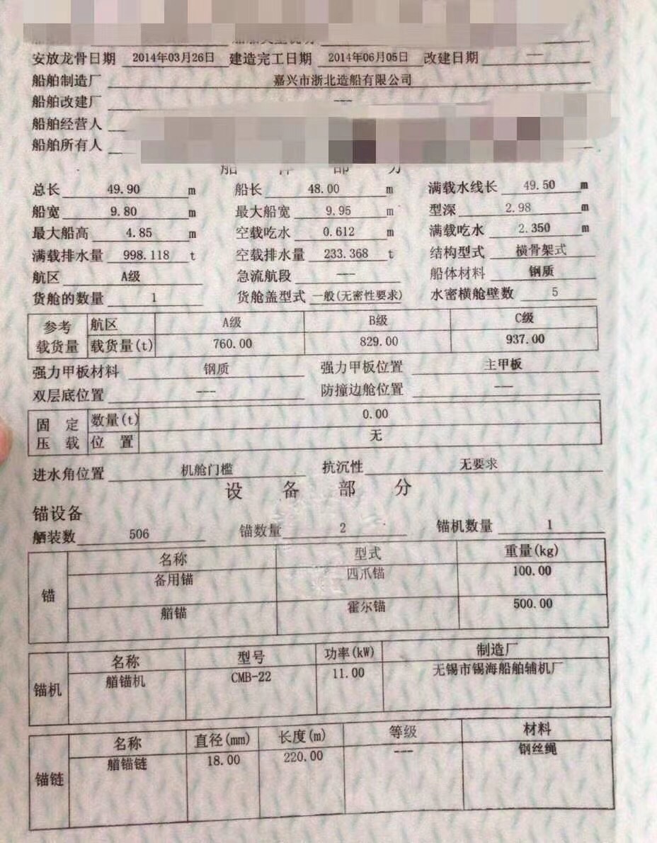 2014年6月浙北船厂(平湖东港)建完工。泡沙水槽大检时同时做好,方护木,前液压,后楼1.5米。仓,挂8个,其它全10个。全船T型结构,不用挖机过。13道龙筋,下料50.前后空调,双发电机组。A级长江线,双站通仓到底,双污已装好,配员二类十普通。质量精工,配套设备齐全,嘉兴港。