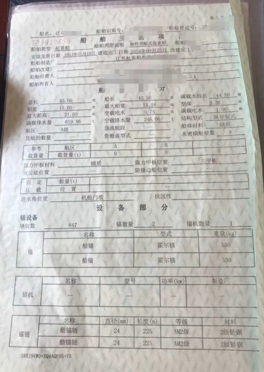 江苏户籍,船长45宽15.2型深2.2米,开船动力300马力x2,底筒10米,