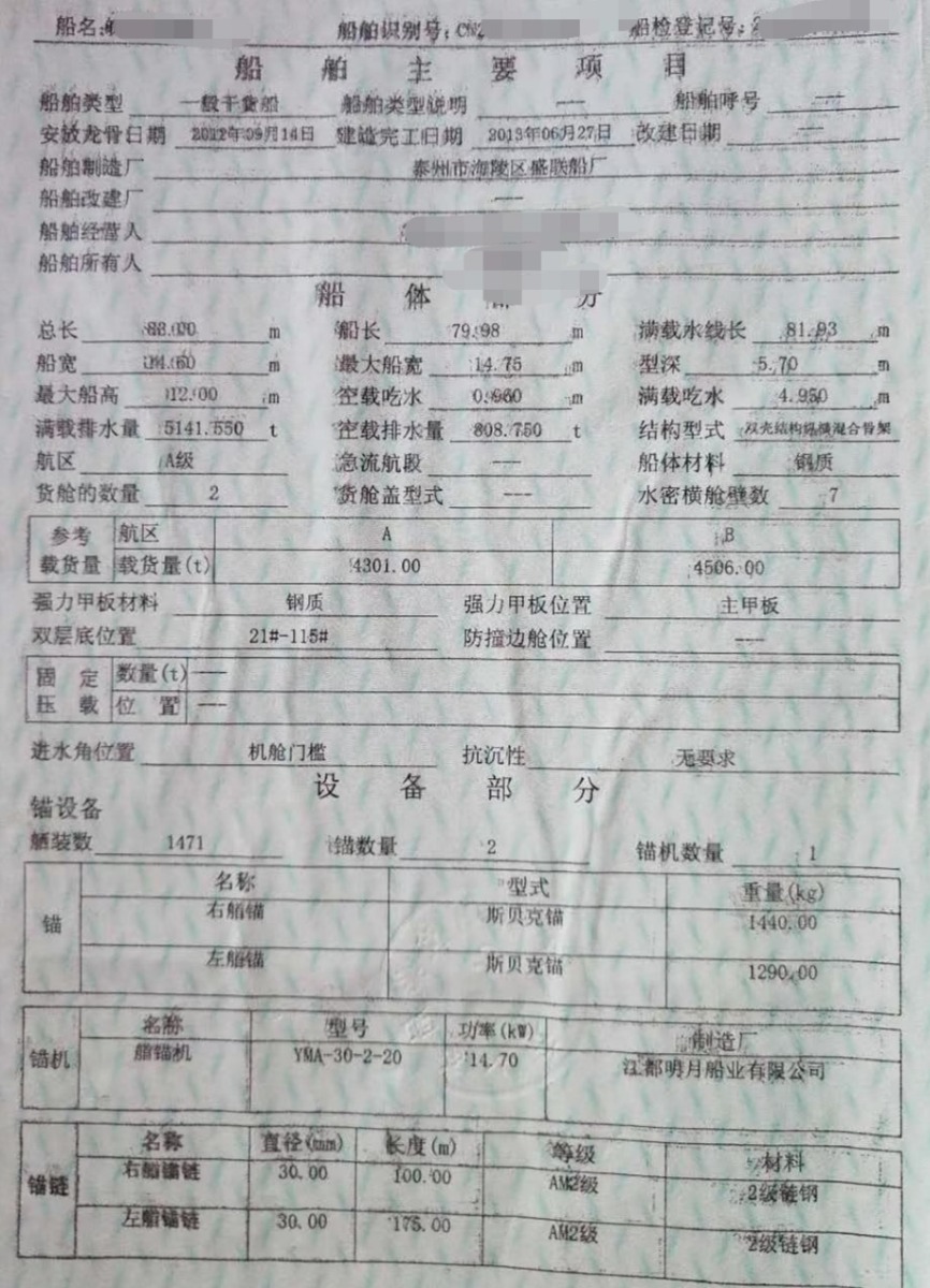 吉船长宽深:83米+14.60米+5.7米; 主机型号:淄博620-6170x2;