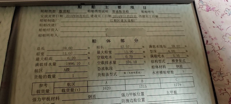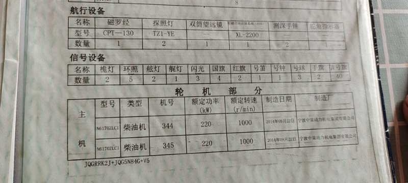 吉船长宽深:59.6米+11.6米+4米; 主机型号:宁波中策6170 350x2;