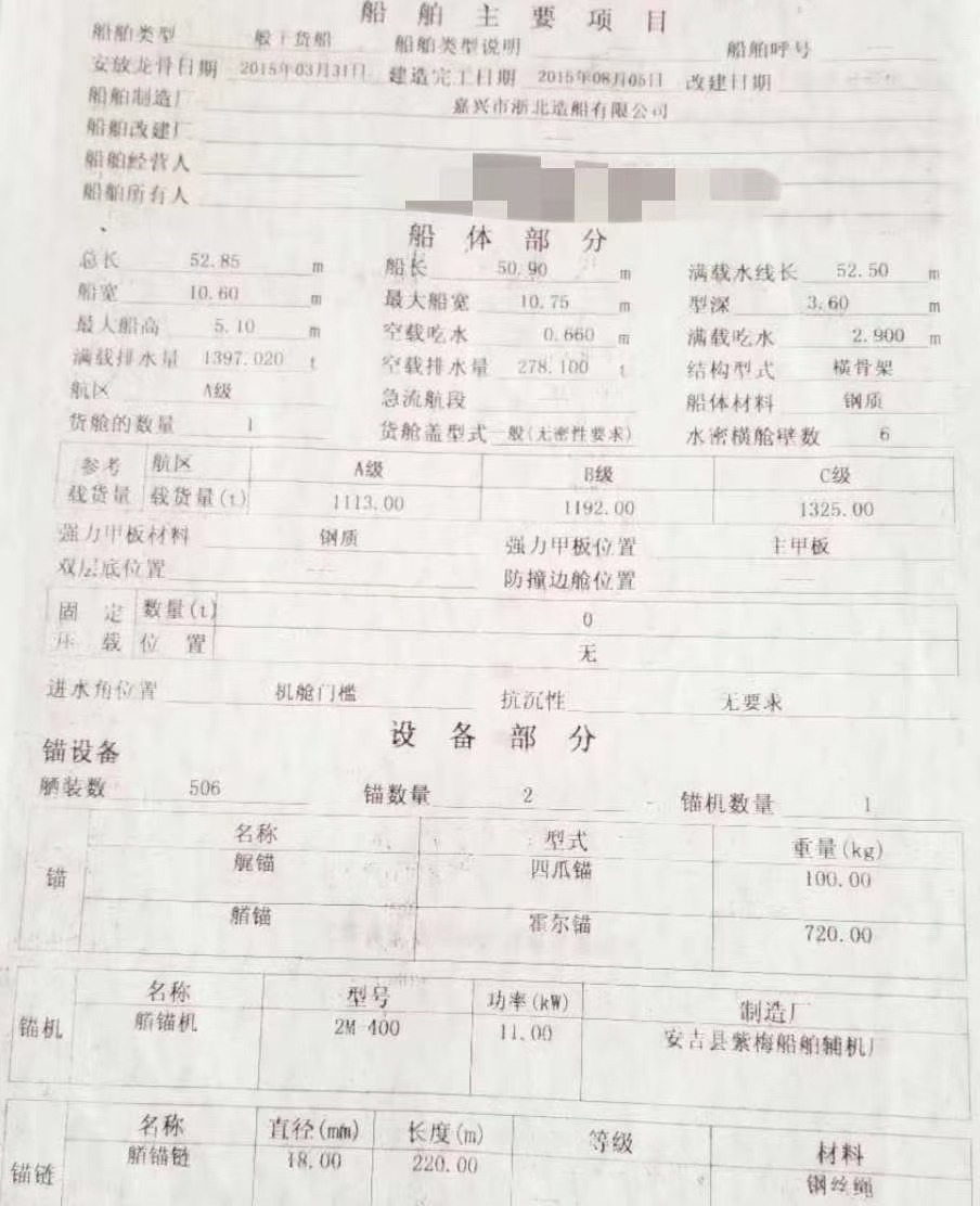 双站全强,甲板.大川.水绞.底板,船头10个板,仓32/34米,楼1.56米,总吨598,