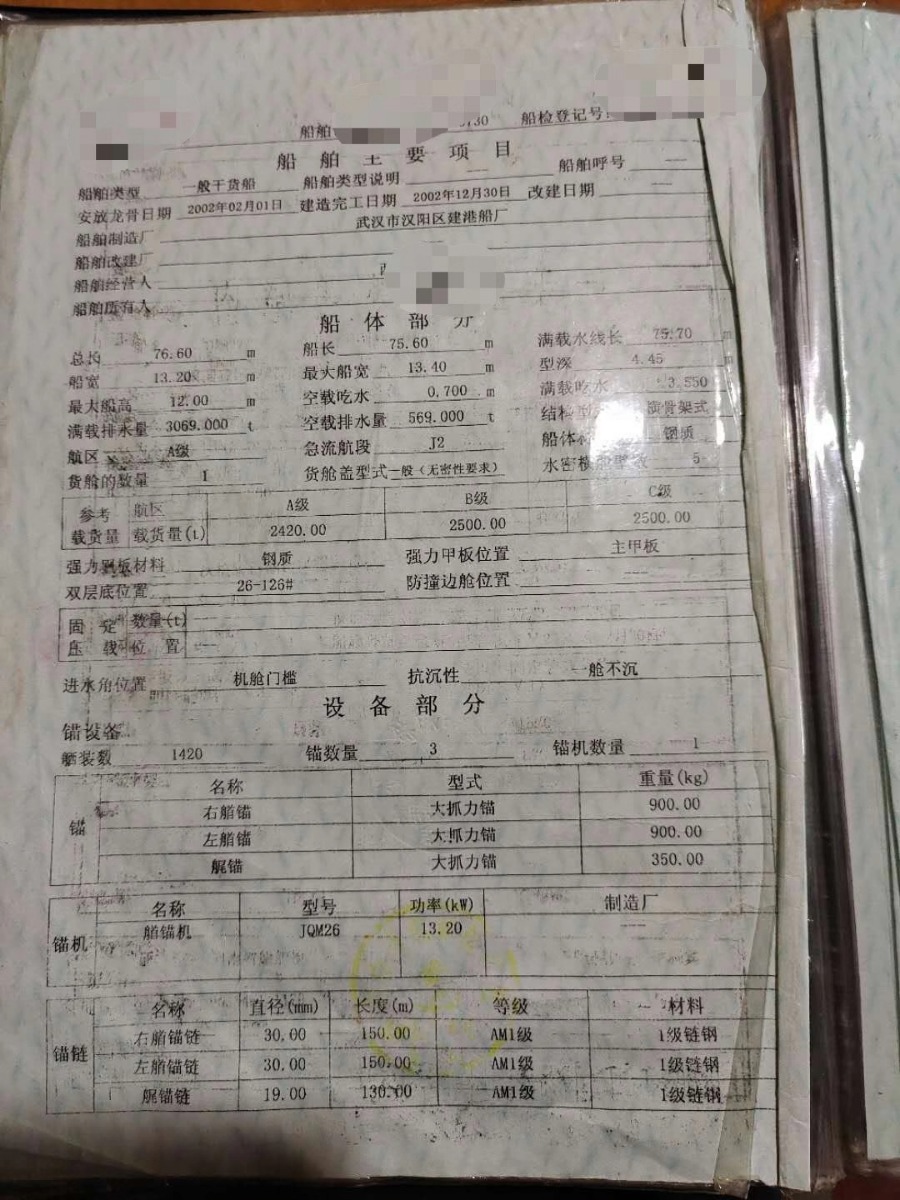 吉船长宽深:76.6米+13.2米+4.45米; 主机型号:淄博408×2;
