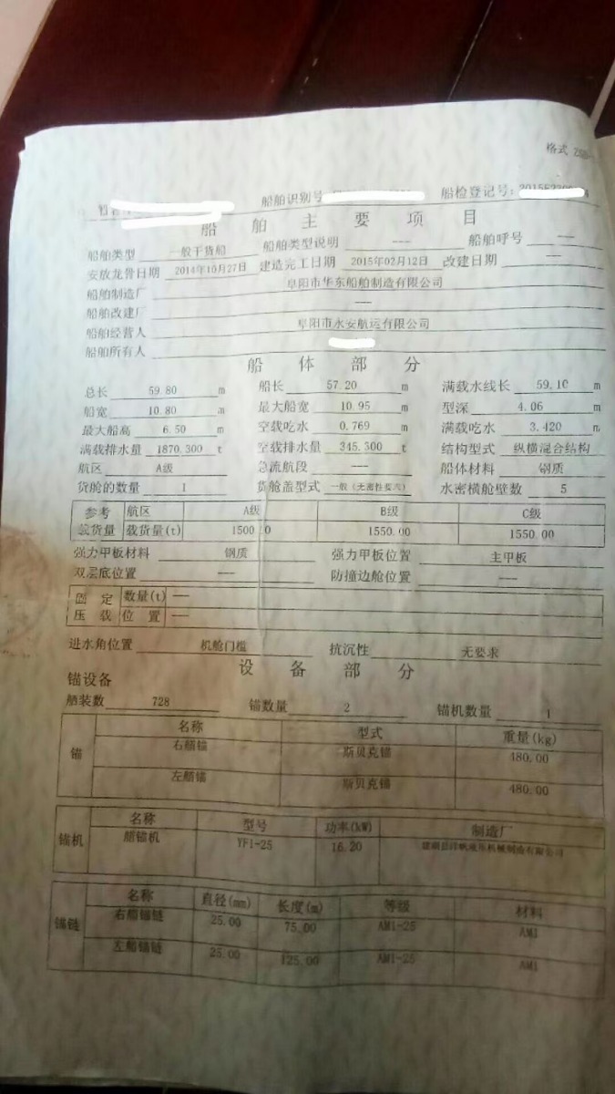 吉船售:59.8/10.8/4.06米,2015年2月建于阜阳华东船厂[太和],总吨781t,