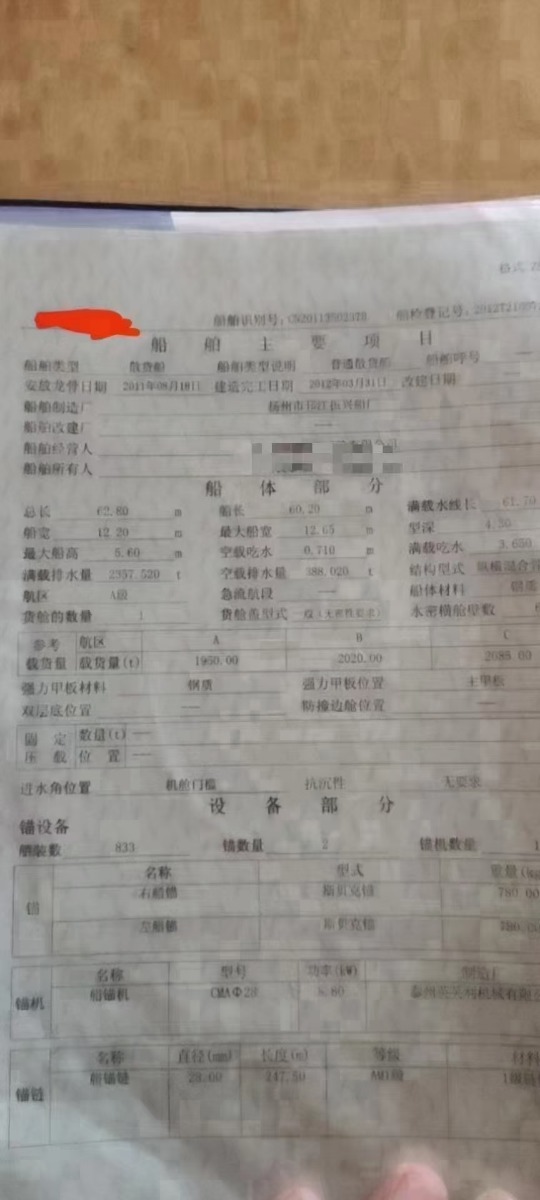 设备高频,雷达等都齐全,前后三个锚,机划子都有,没有自动封仓架,