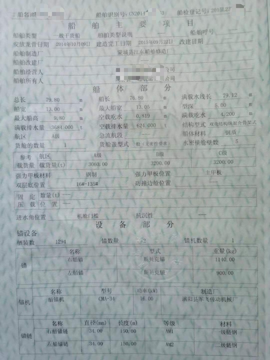 2015年11月开航,前后驾驶后面是一楼半,两台潍坊540,大杆仓口14船板,二层板12