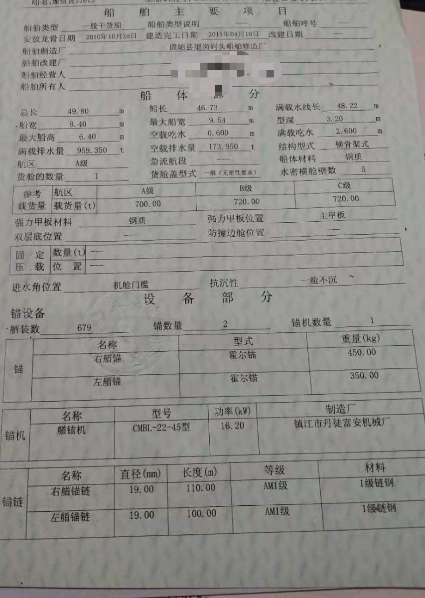 吉船长宽深:49.3米+9.4米+3.2米; 主机型号:淄博408;