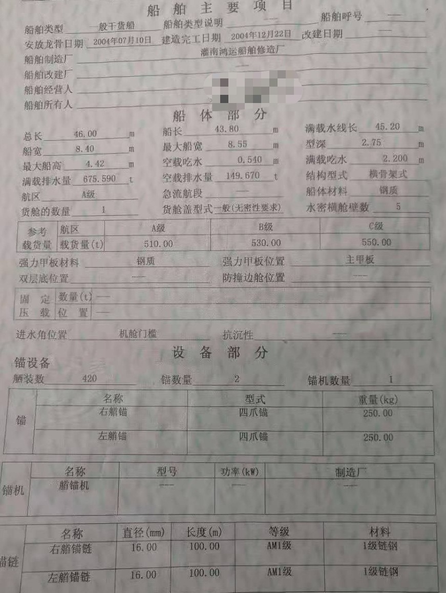吉船长宽深:46米+8.4米+2.75米; 主机型号:6170-350;