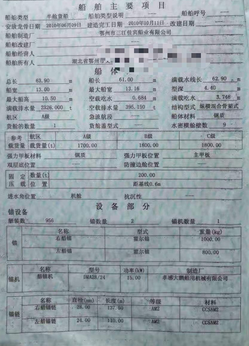 船长64米,宽13米,型深4.4米,仓口净长43.5米,