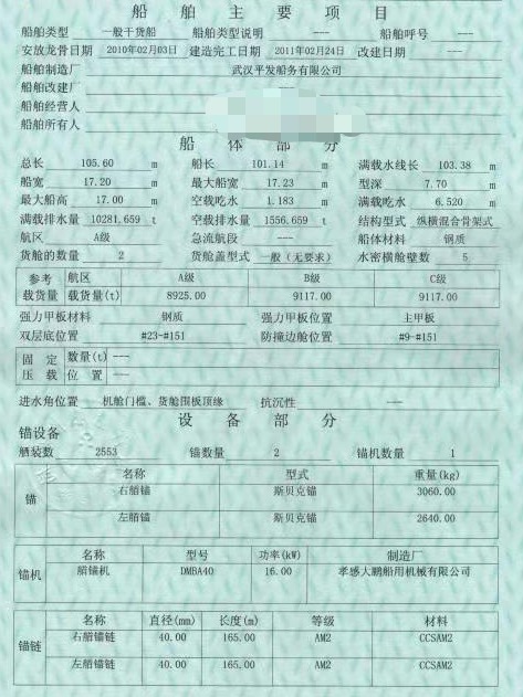 2011年2月武汉造 长105.6米,宽17.2米,深7.7米。
