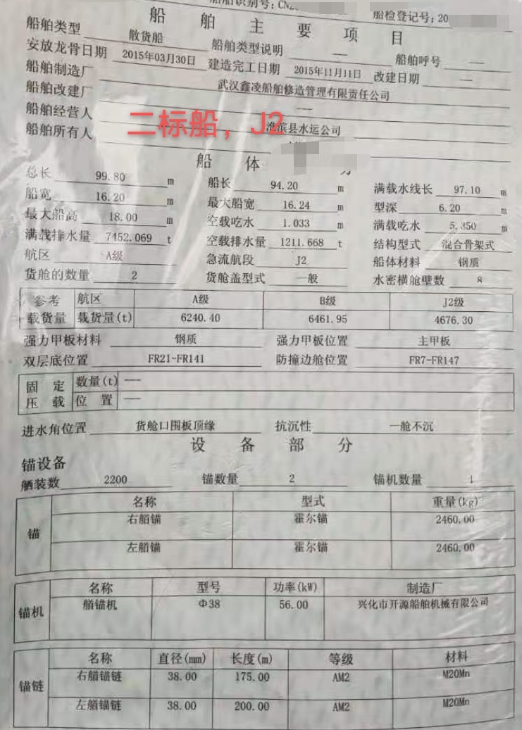 吉船长宽深:99.8米+16.2米+6.2米; 主机型号:重柴6200/950x2;