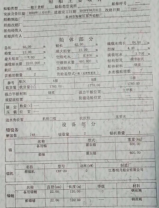 货船66*12*4.4中驾驶,2009年泰州造安徽户;用料7*75双站满梁双甲板,板厚底挂二层板8,甲川10;仓口40米,总吨1026,主机潍柴480*2;报价160万