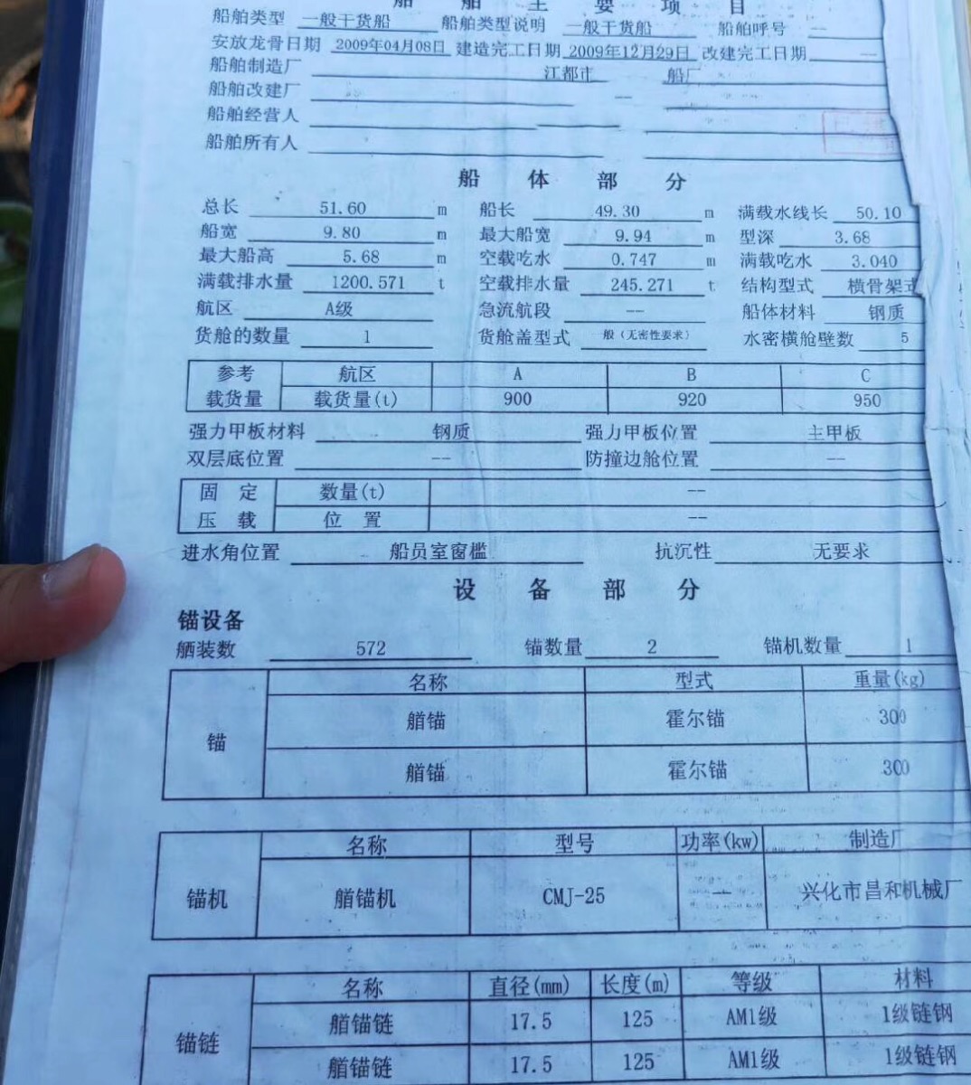 吉船出售51.6*9.8*3.68。前驾驶一楼半,2009年12月江都造江苏户;用料13*50双站通仓,板厚底挂二层板8,甲川10;仓口32米,总吨538,后楼1.65米,主机淄博480;船主报价119.8万。