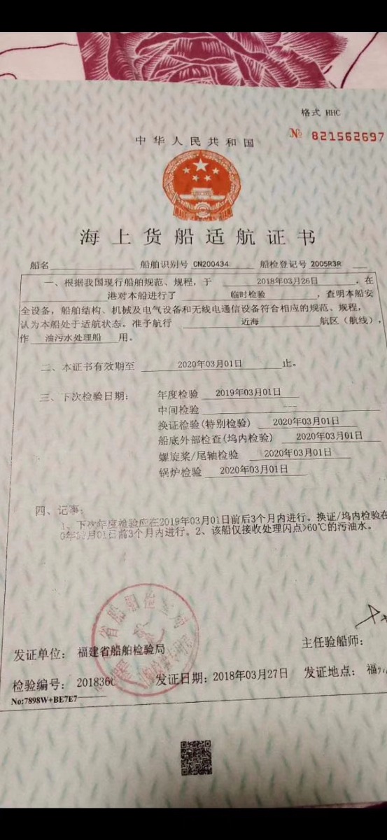 油船出售1000吨油污水处理船:2005年浙江造,总长54.90m/船宽8.60m/型深4.50m/满载吃水3.85m/主机潍坊6170型:船级社ZC:在航船舶、船况很好:价格实惠,