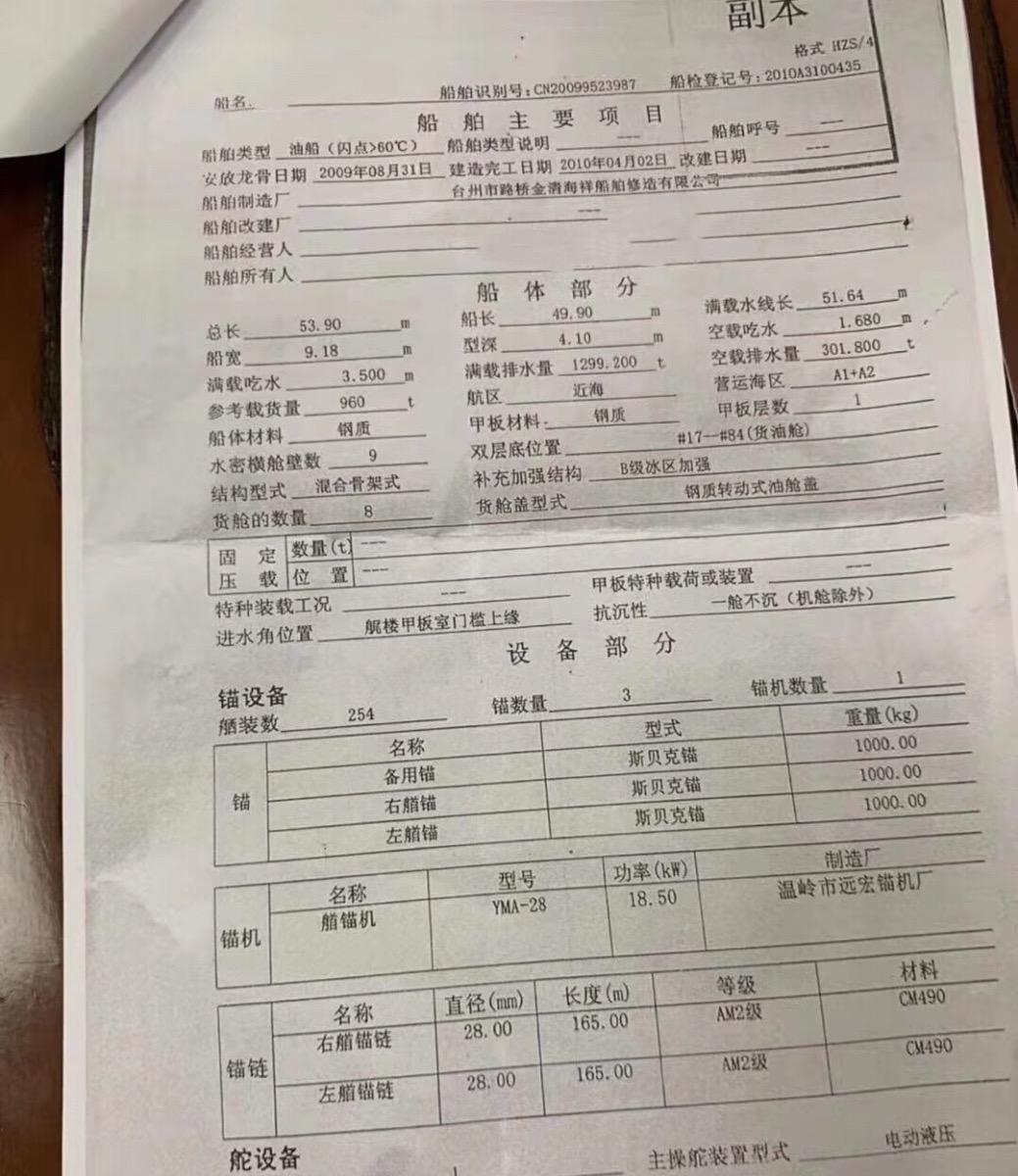 出售1000吨油船:2010年台州造,总长53.90m/船宽9.18m/型深4.10m/满载吃水3.50m/主机济柴6190型 218kw 船级社ZC:船况很好、现在保养中.