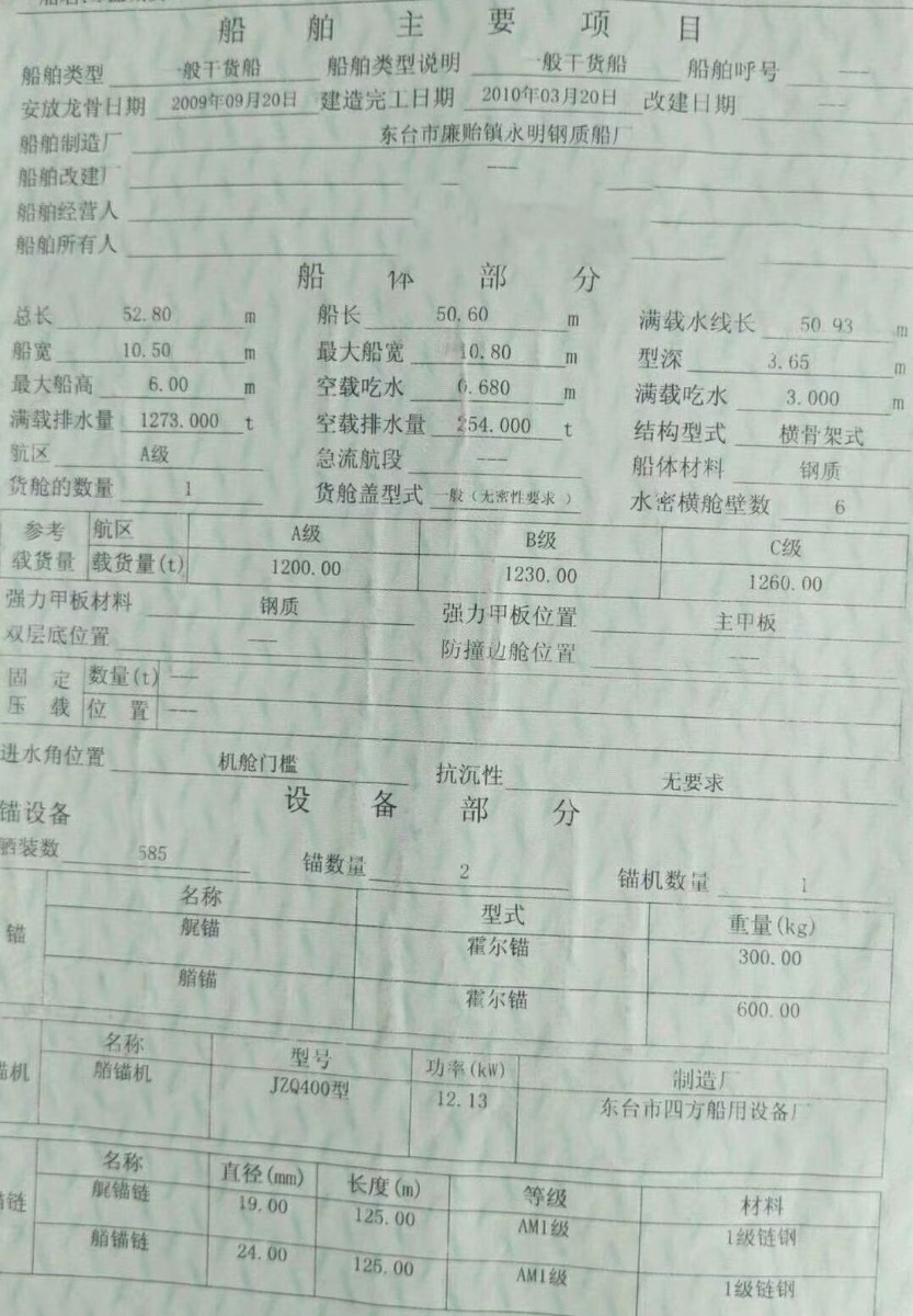 发财船52.8*10.5*3.65前驾驶液压楼,2010年6月东台加工江苏户;用料15*50通仓双站全强,板厚水甲川10,挂板二层板8个;仓口33米,主机潍柴275/2台,总吨625.保养好,后楼不高,开价148.8万