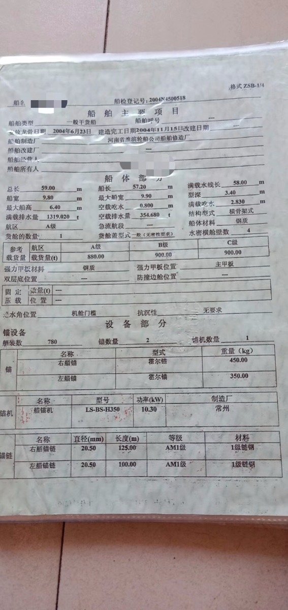 吉船出售:长59,宽9.8,深3.4计1376吨04年11月淮宾2*275,双占通仓河南户 A级航区880吨核载
