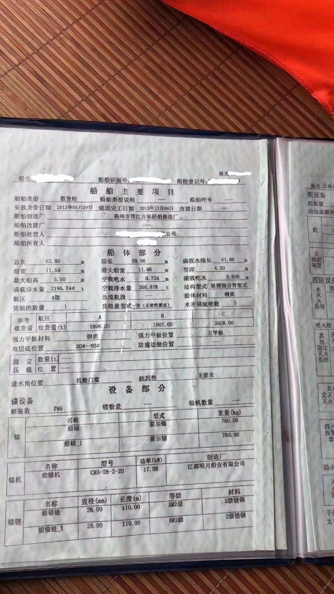 吉船尺寸62.8,11.5,4.3,报价256万,宁动408X2,2013年12月。 扬州邗江造 ,尖头前驾固定娄,安微手续,高低龙筋9道,下料75 ,大川甲板水绞10 ,挂板船底二层板8 双占通仓,双层甲板,货仓40米,前面3道梁,双锚头,总吨935,后大娄1.7米,尾排,配员3人,A710,B560,C410。