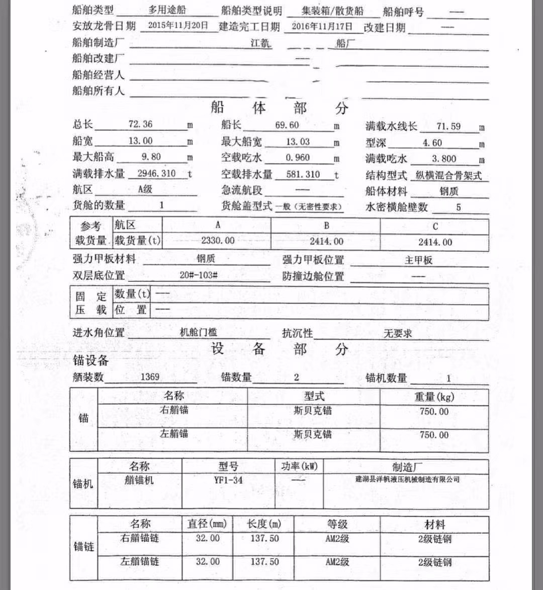 吉船72.36*13*4.6前驾驶两楼丁(4*4多用途船),2016年11月江都造安徽户;用料9*75,板厚外壳二层板10,甲川12;总吨1556,主机540*2,有合肥线路,空箱136,重箱104;报价358万
