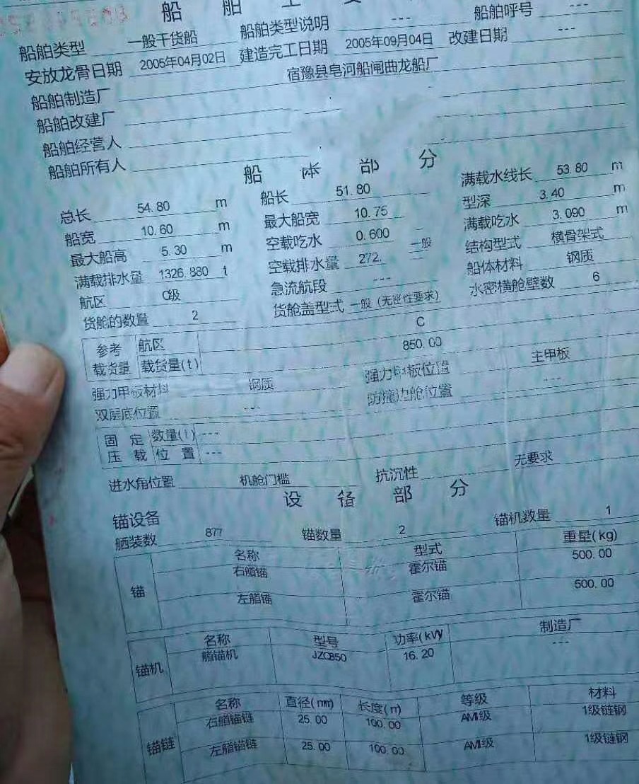 吉船54.8*10.6*3.4前驾驶一楼半,2005年宿迁造江苏户;用料13*50,板厚6-8-10;主机上柴240*2,机器2012年安装,报价56.8万