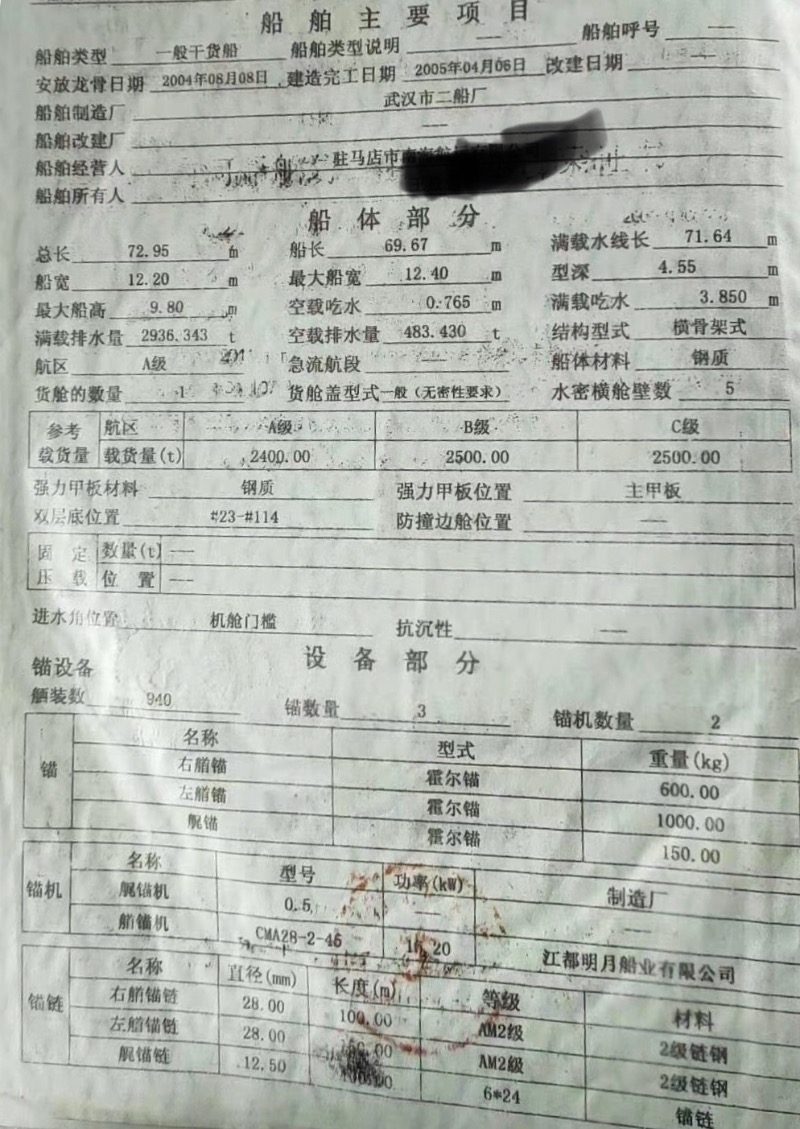 出售3000吨散货船,72.95Ⅹ12.4X4.6,尖头中驾二层固定楼,05年4月武汉二厂造,主机潍柴350马力X2.,航速快,船刚上坞做了油漆,污水处理器已装,航行设备齐全,甩杆雷达,船舶该配的设备都是全的,价168万,船主诚心出售,非诚勿扰!