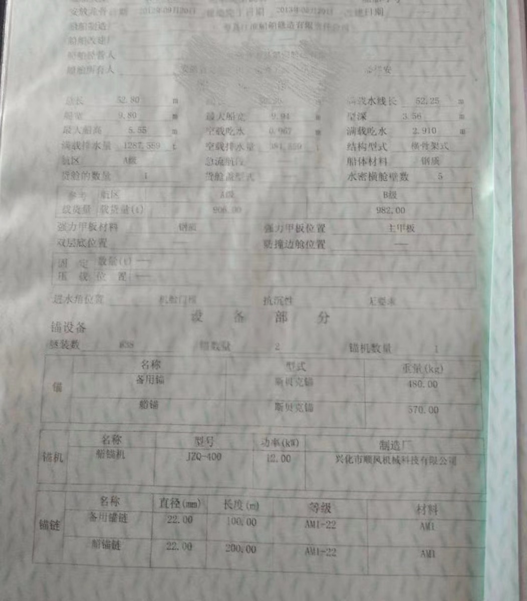 吉船52.8x9.8x3.56 2013.5月寿县船厂打造 龙筋13道 下料52 马力潍柴480 配员两位 手续安徽 开价120万